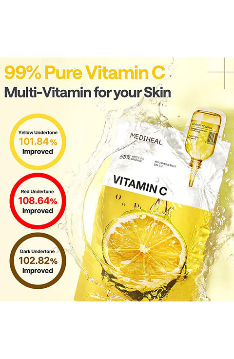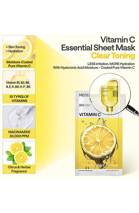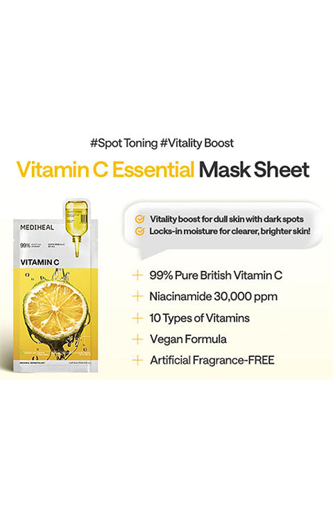 Mediheal VITA Mask: Upgrade bright VITA by 4.8 times - Brightening skin tone for radiant skin. - Vitalizing and Moisturizing - Key Ingredients: VITA ACTIVE 3X + Mediheal's Patented Ingredient HYDRODEEPER - Skin irritancy test completed (Skin Irritation index is 0.00) - Part of Essential Collection → Mediheal's healing line with added mild, pristine ingredients in a sheet mask - The mask sheet is made of bamboo to pursue eco-friendly vegan and bio-degradable certified → Added Advantages of new sheet include adhesion/moisture retention/ skin tightening - Uses FSC certified paper with eco-friendly soy ink for box packaging for a better tomorrow.