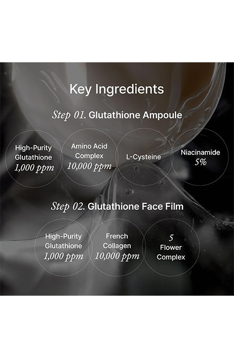 1 Step: Water(Aqua), Glycerin, Butylene Glycol, Niacinamide, Propanediol, Methylpropanediol, Caprylic/Capric Triglyceride, 1,2-Hexanediol, Hydroxyethyl Acrylate/Sodium Acryloyldimethyl Taurate Copolymer, Alcohol Denat., PVP, Polysorbate 20, Ammonium Acryloyldimethyltaurate/VP Copolymer, Glutathione, Sorbitan Isostearate, Ethylhexylglycerin, Fragrance(Parfum), Menthyl Lactate, Adenosine, Glycine, Disodium EDTA, Serine, Glutamic Acid, Melia Azadirachta Leaf Extract, Aspartic Acid, Leucine, Melia Azadirachta Flower Extract, Leucojum Aestivum Bulb Extract, Curcuma Longa (Turmeric) Root Extract, Alanine, Lysine, Arginine, Tyrosine, Phenylalanine, Valine, Threonine, Proline, Isoleucine, Histidine, Methionine, Cysteine, Ocimum Sanctum Leaf Extract, Corallina Officinalis Extract, Tocopherol, Ascorbic Acid.