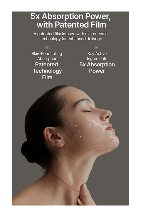• Dual-Action Absorption Film: A two-step process combines a plumping ampoule with a patented film designed to adhere seamlessly to the neck. The unique film enhances absorption, deeper hydration, and maximizes delivery of active ingredients.